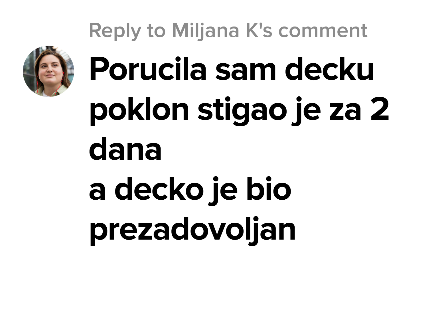 „Poručila sam pre dva dana i već danas mi je kurir bio na vratima. Nisam mogla da verujem koliko brzo stiže! Sve pohvale za brzinu i organizaciju, samo nastavite ovako!“ -